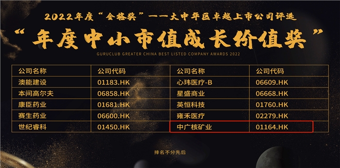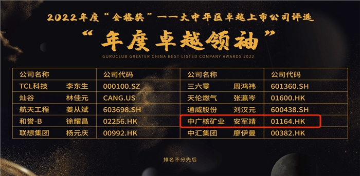 本次獲獎顯示出市場及投資者對安軍靖先生及中廣核礦業(yè)在資本市場上的突出表現(xiàn)所給予的充分肯定和高度評價,同時也凸顯了資本市場對天然鈾行業(yè)前景及公司潛力的極大認可。中廣核礦業(yè)將持續(xù)耕耘,繼續(xù)致力于推動行業(yè)發(fā)展,優(yōu)化社會環(huán)境治理及可持續(xù)發(fā)展,努力開拓市場,不斷提升企業(yè)價值,用更加優(yōu)異的成績回報各位股東。