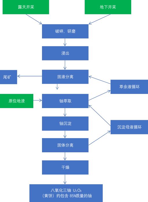 世界主要鈾礦的開采方式包括三種:原位地浸開采,露天開采及地下開采。世界約48%的天然鈾通過原位地浸開采生產(chǎn)出來,46%來自于常規(guī)開采方法(露天開采及地下開采)生產(chǎn)出來,6%作為其他礦產(chǎn)品副產(chǎn)品采出。 鈾礦開采生產(chǎn)工藝示意圖 2017年世界各國產(chǎn)鈾比例(總產(chǎn)量為59,531噸鈾) 原位地浸開采 原地浸出采鈾是將溶浸液通過注液鉆孔注入到可滲透的含礦含水層,使溶浸液在滲透過程中與鈾接觸并進(jìn)行溶解反應(yīng),生成含鈾溶液,并從抽液孔被抽至地表,輸送到車間加工處理后獲得鈾產(chǎn)品的流程。 ? 適用賦存于含水及可滲透砂巖中鈾礦物開采。 ? 圈定鈾礦的邊界品位為0.001%。 ? 根據(jù)浸出機(jī)理的不同,分為酸法和堿法開采。 開采的適用條件: (1)含礦巖性應(yīng)為具有滲透性的砂巖、砂礫巖。礦體賦存于地下水位以下的含礦含水層中。充水性和滲透性是地浸是否可行的決定性因素。 (2)礦體產(chǎn)狀平緩(傾角一般小于10度),礦體頂?shù)装鍛?yīng)是良好封閉的不透水層。 (3)礦床平米鈾量應(yīng)在最低經(jīng)濟(jì)指標(biāo)之上,含礦含水層中碳酸鹽含量>2%則不宜用酸法浸出。圍巖以長石石英質(zhì)或石英質(zhì)砂巖最宜。 (4)按照目前鈾價,開采礦體最大埋藏深度不宜超過400-600m。 浸出機(jī)理 酸法 主要使用硫酸作為溶浸劑,礦石中鈾隨溶浸液pH值的下降2以下后從沉淀態(tài)變?yōu)槿芙鈶B(tài),生成硫酸鈾酰溶液。含礦含水層中碳酸鹽含>2%則不適用。 堿法 主要使用碳酸氫銨作為溶浸劑,礦石中鈾隨溶浸液pH值上升到9以上后礦石中的6價鈾與碳酸鹽中的碳酸根(CO32-)絡(luò)合,生成碳酸鈾酰溶液。產(chǎn)品液鈾含量低,銨鹽也造成地下水污染。 二氧化碳+氧氣 原理是氧氣氧化礦石,在地下水中加入二氧化碳后,形成的碳酸氫根(HCO3-)離子與礦層中的鈾發(fā)生反應(yīng),使鈾溶解在溶液中,也屬于堿法浸出分類。 細(xì)菌浸出 主要選用氧化鐵硫桿菌,在浸出鈾的過程中,主要起間接催化作用,能促進(jìn)黃鐵礦和硫酸亞鐵的氧化,促進(jìn)6價鈾生成。可降低酸耗。需配合酸法使用,但并非一種獨(dú)立的浸出方法。 地浸的主要優(yōu)點(diǎn): (1)開采方法安全簡單、工藝流程短。采礦階段無需搬運(yùn)、破碎礦石,水冶階段無需磨礦和固液分離,縮短了采冶工藝流程,直接生產(chǎn)成本低。 (2)礦山建設(shè)周期短、基建投資少,勞動強(qiáng)度低、自動化程度高,固定資產(chǎn)折舊低。 (3)環(huán)境污染小。一是抽注基本平衡,地浸溶液是在閉路管道內(nèi)循環(huán)使用,其廢水排放量顯著減少;二是放射性粉塵污染得到徹底改善;三是尾渣和廢氣的污染減到了最低程度。 露天開采即一個移走礦體上的覆蓋物,從敞露地表的采礦場采出鈾礦物的過程。主要適用于主礦體埋藏較淺的鈾礦床開采。 主要優(yōu)點(diǎn)包括: 1. 基建周期短。2-4年/大型 6-8月/小型。 2、開采空間大,勞動生產(chǎn)率高。比地下開采高2-10倍。 3、礦石損失、貧化率較小。損失率3%-5%貧化率5%-8%。 4、開采成本低,勞動條件好,生產(chǎn)安全。 主要缺點(diǎn): 1、開采受到氣候影響大。 2、基建設(shè)備投資大。 3、礦山占地多,對地表環(huán)境破壞大。 地下開采即通過開掘井巷工程從地下礦床的礦塊里采出礦石的過程,通過礦床開拓、礦塊的采準(zhǔn)、切割和回采4 個步驟實(shí)現(xiàn)。主要適用于埋藏較深及地表不允許露天開采的鈾礦床。以地壓管理方法為依據(jù),分為空場采礦法充填采礦法、崩落采礦法三大類。